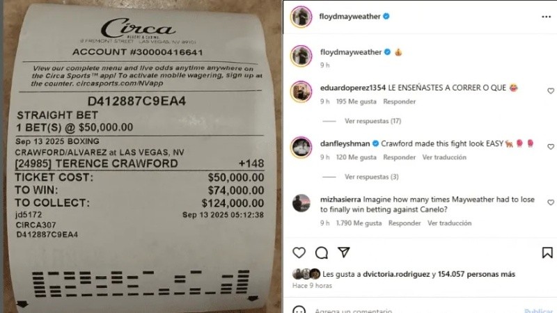 El ex boxeador estadounidense apostó 50mil dólares a favor de Crawford en Las Vegas y se llevó un total de 124 mil dólares, por lo que ganó 74 mil dólares.