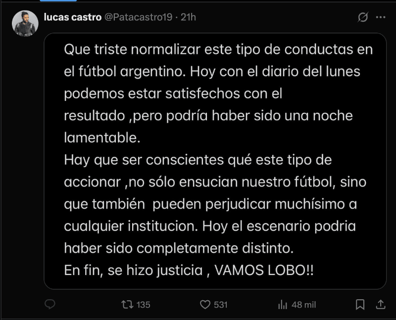 “Hoy el escenario podría haber sido completamente distinto, en fin, se hizo justicia, vamos lobo!”, cerró el Pata el posteo.